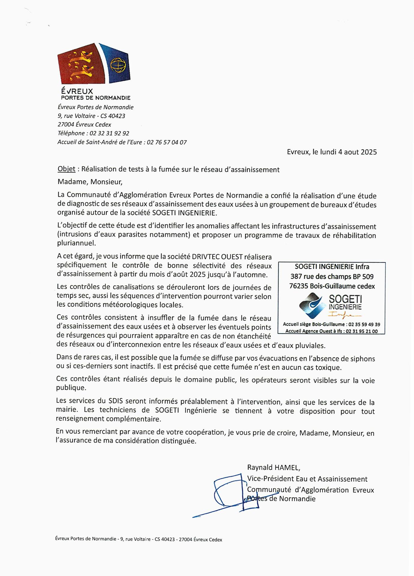 Dans le cadre du schéma directeur d'assainissement du territoire de l'agglomération EVREUX PORTES DE NORMANDIE, un bureau d'études SOGETI va engager avec l'entreprise DRIVTEC des campagnes de contrôles sur les réseaux de branchements d'assainissement des eaux usées desservant notre commune.