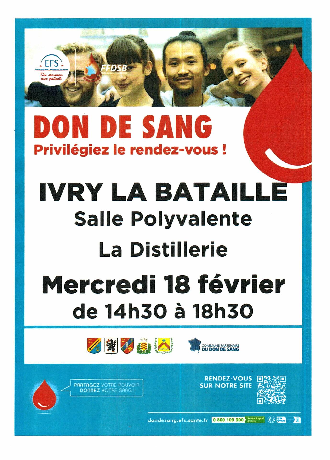 Prochaine collecte de sang à la Salle Polyvalente La Distillerie d'Ivry la Bataille le mercredi 18 février 2026 entre 14h30 et 18h30.